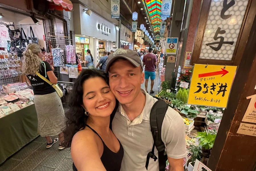 Nishiki Market is a foodie's paradise that has thrived for over 400 years. The bustling arcade is packed with stalls offering an enticing array of local specialties. As we navigated the crowded aisles, we indulged in small strawberry chocolate ice cream bites, reminiscent of mochi, and a refreshing mango popsicle. These treats were perfect for satisfying our sweet cravings while we waited for the rain to subside.
